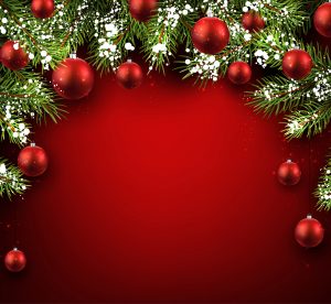 Christmas red background with fir branches and balls. Vector illustration.